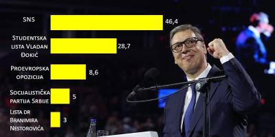 Prema rezultatima tog istraživanja, da se izbori održavaju u nedelju, Srpska napredna stranka (SNS) osvojila bi 46,4 odsto glasova, dok druga najjača politička snaga u zemlji – “Studentska” lista – Vladan Đokić uživa podršku od 28,7 procenata građana.